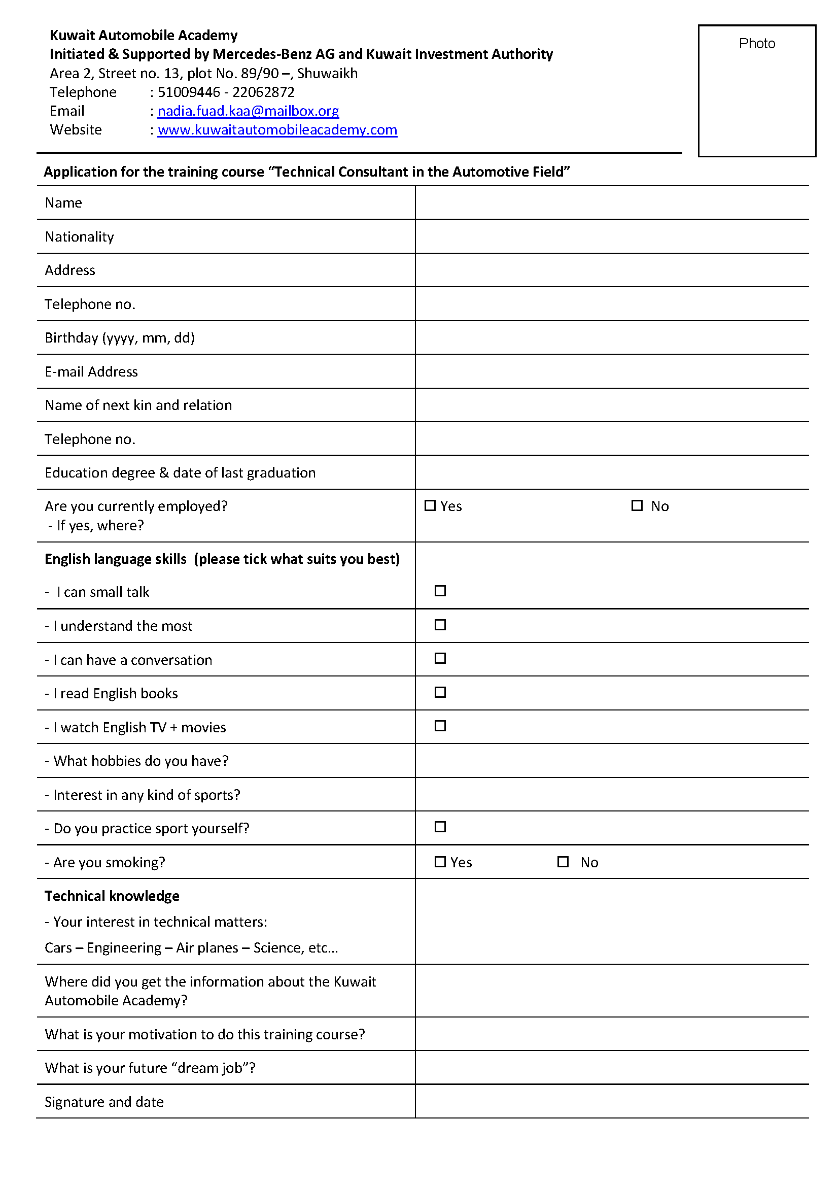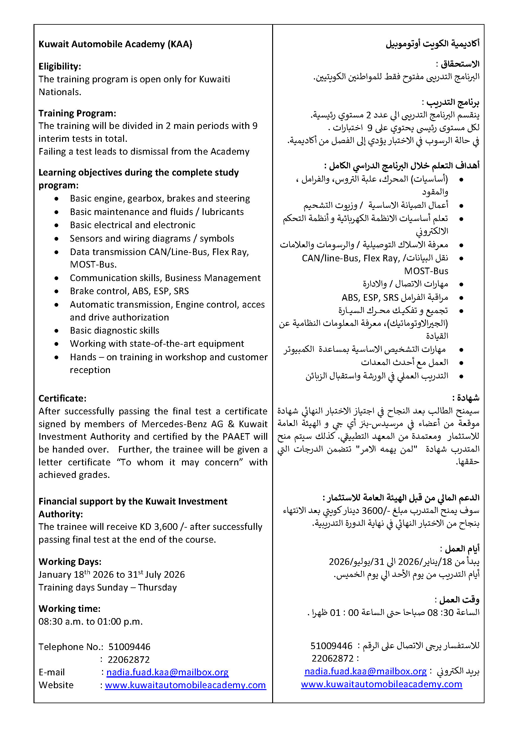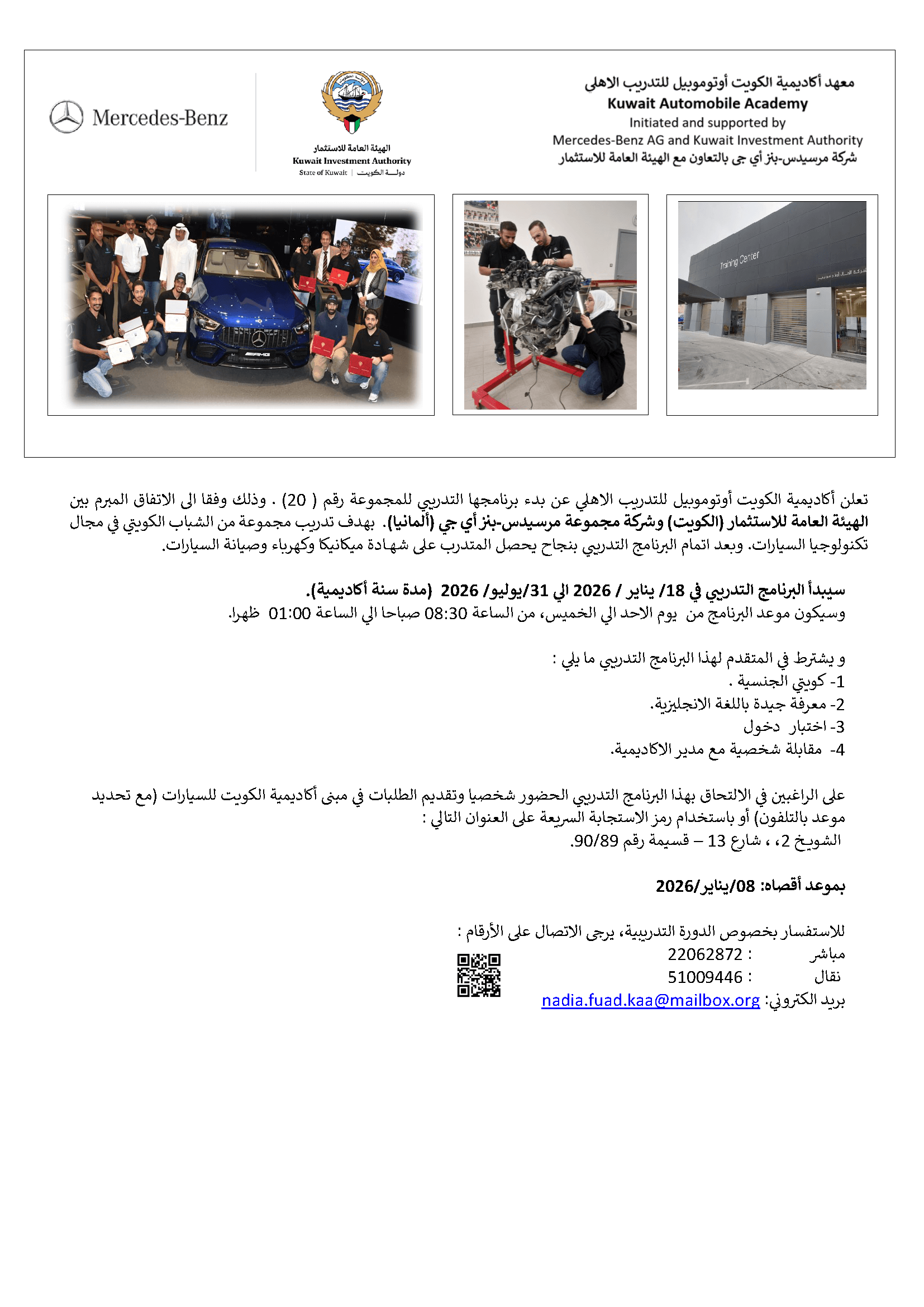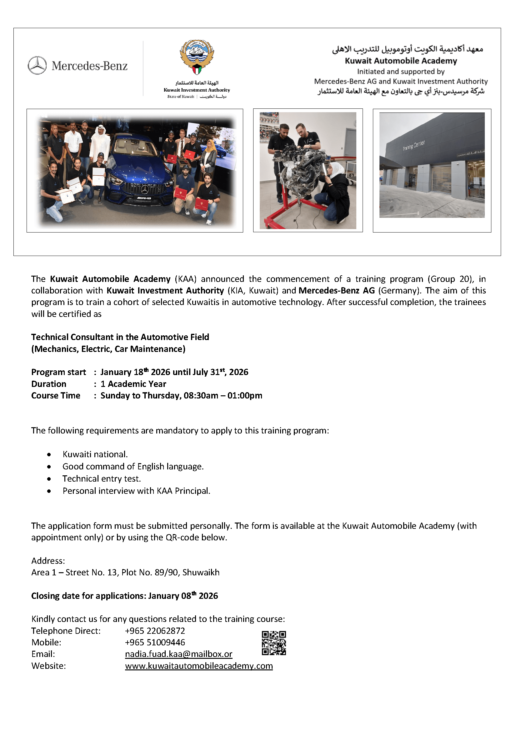 Under this agreement, a training course was established to provide Kuwaiti Nationals with the skills required to work in the Automobile industry. Mercedes-Benz AG, who succeeded Daimler AG as partner of the agreement, and Kuwait Investment Authority share the belief that they should encourage this sector in the Kuwait economy and its role in supporting national development within Kuwait society . In January 2007, the academy received its first group of students. Since its inception, 18 groups have so far received training. The total number of male and female students has exceeded the 160-mark. The academy accepts up to 12 students annually for a 1-year academic course, starting month and duration to be announced in due time.
